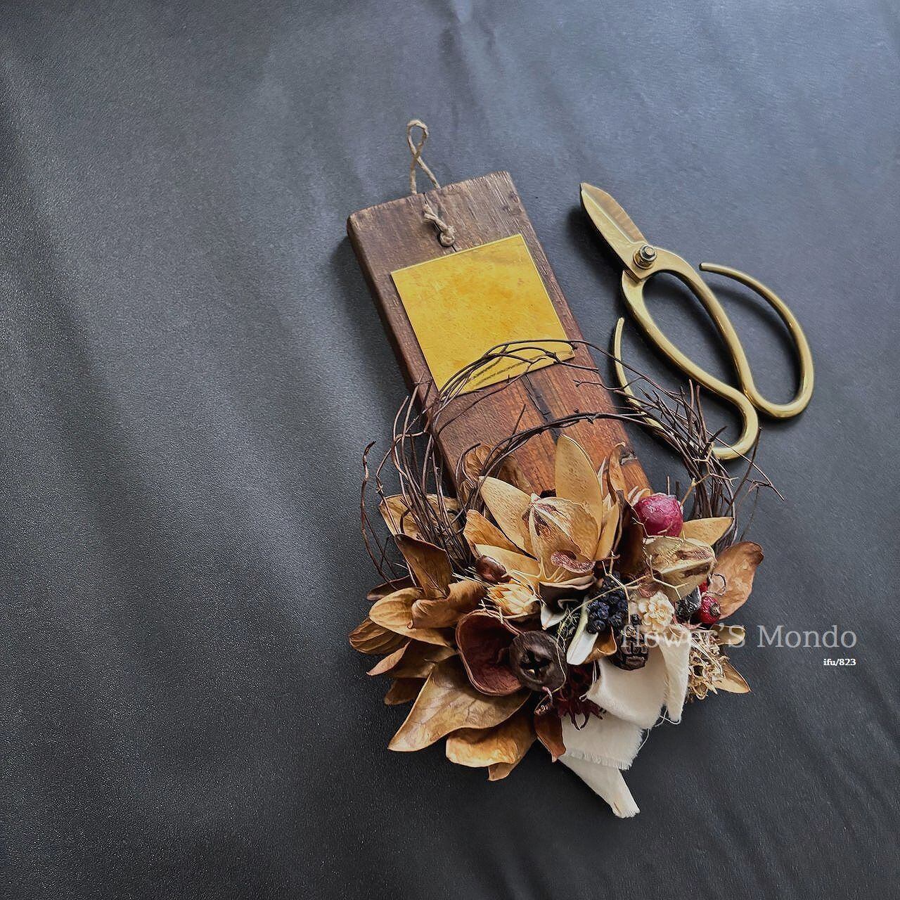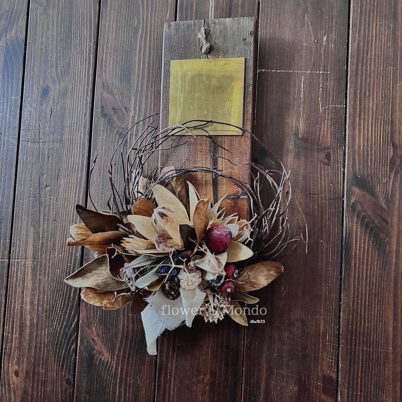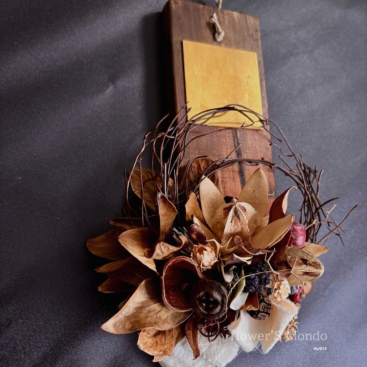 経年劣化な古材と真鍮プレートを組み合わせ、更に歳を重ねてきたお花を組み合わせたインテリア ウォールデコレーションです