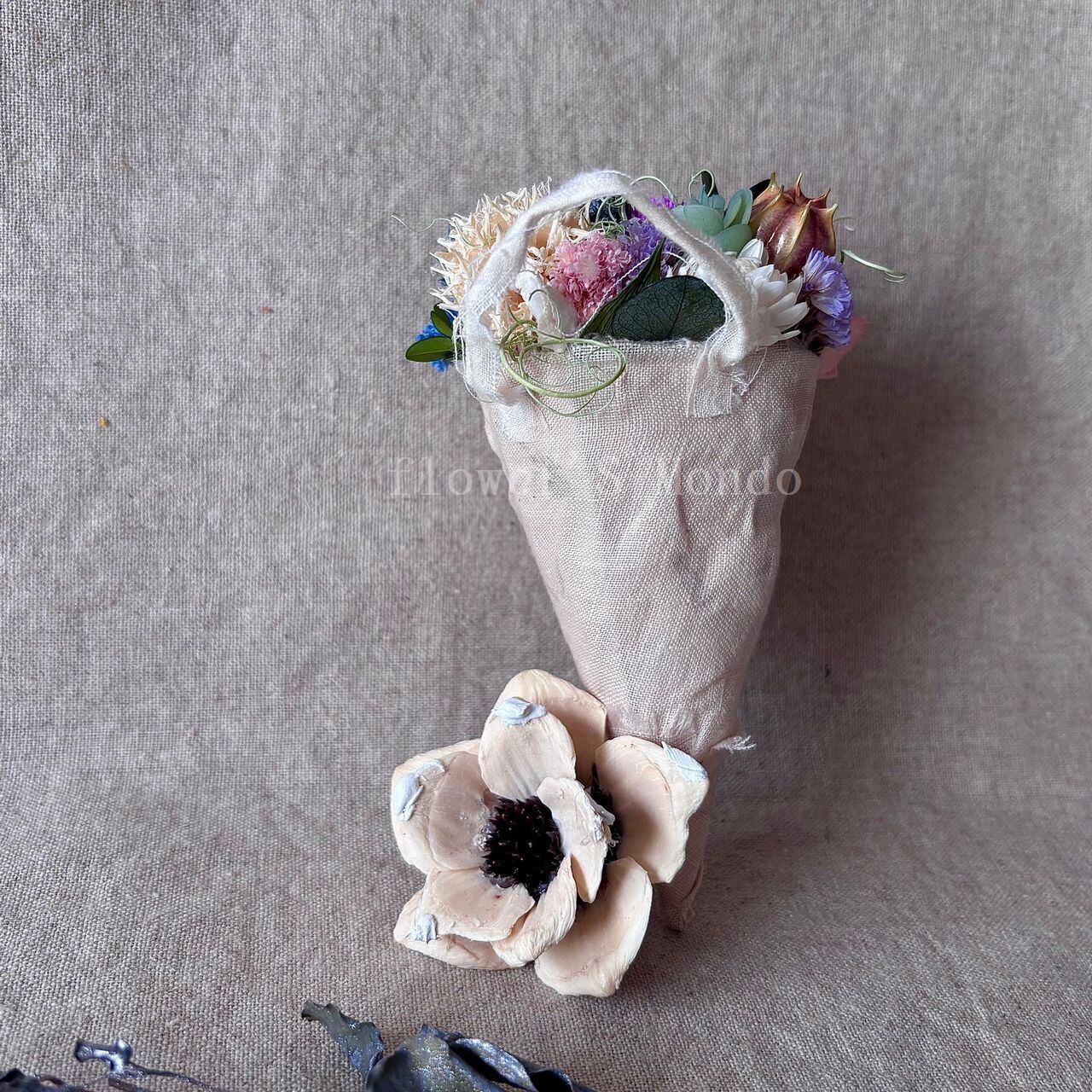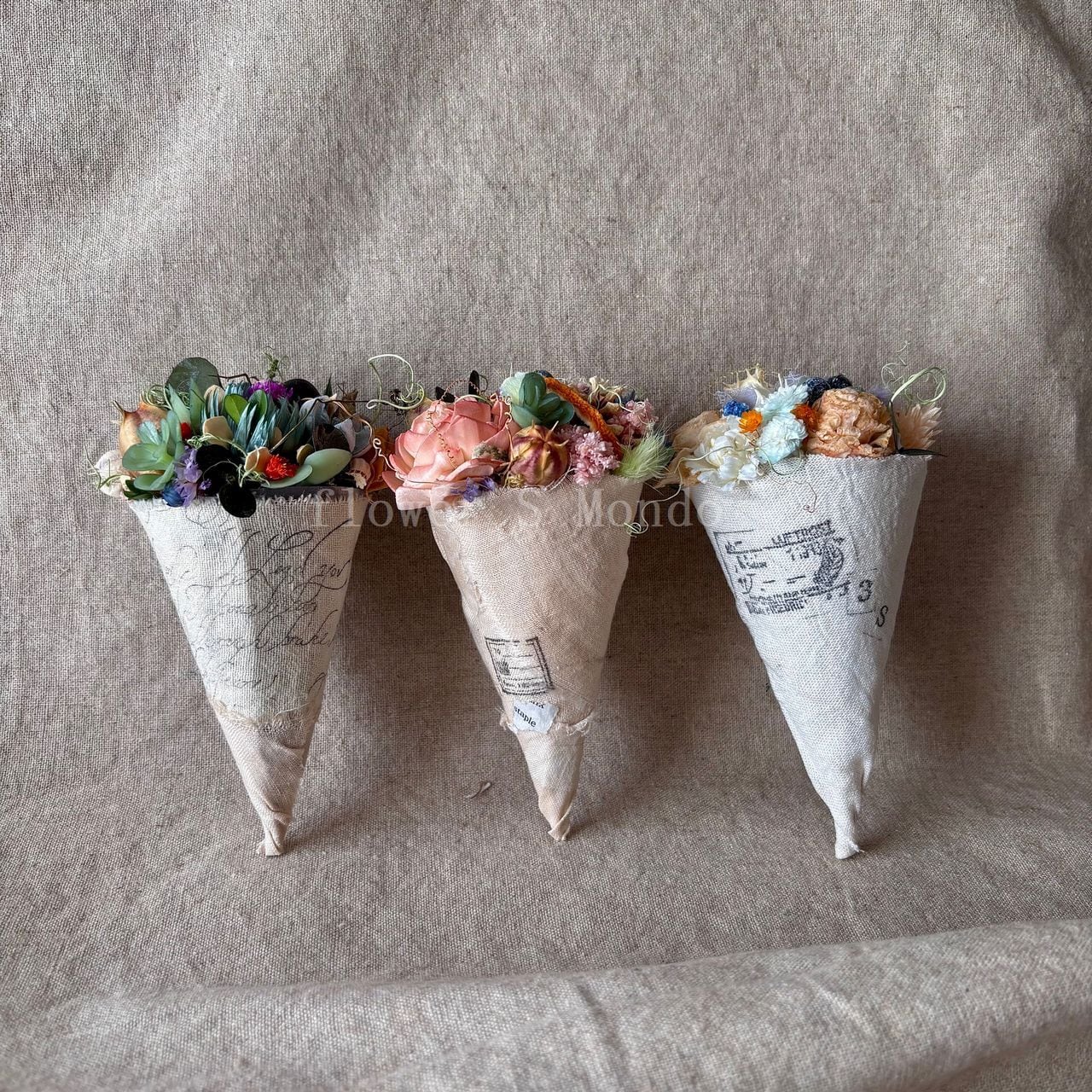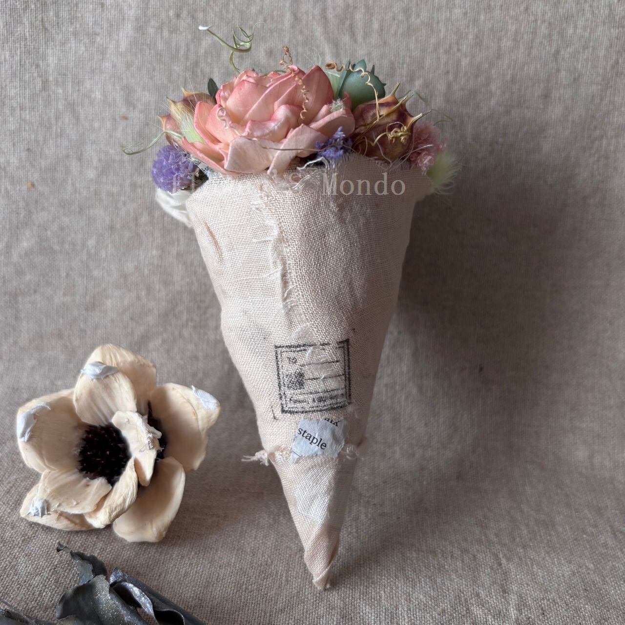 コーンの形にお花を載せたコーンフラワーインテリア ウォール デコレーションです。リネンでコーン部分をあえてアンティーク風に覆い、どちらかといえばノスタルジックなそしてアンティークな雰囲気を出した作品になります。