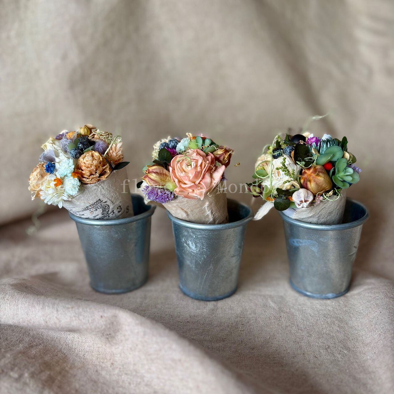 3種類1セットでの販売となります。サイズは下記にも詳細がのっておりますが約1個が20g長さが14㎝直径(上部)7㎝位の手のひらに収まるくらいとなります。材料のメインはドライフラワーですが、少しアーテフィシャルフラワーも使用しております。