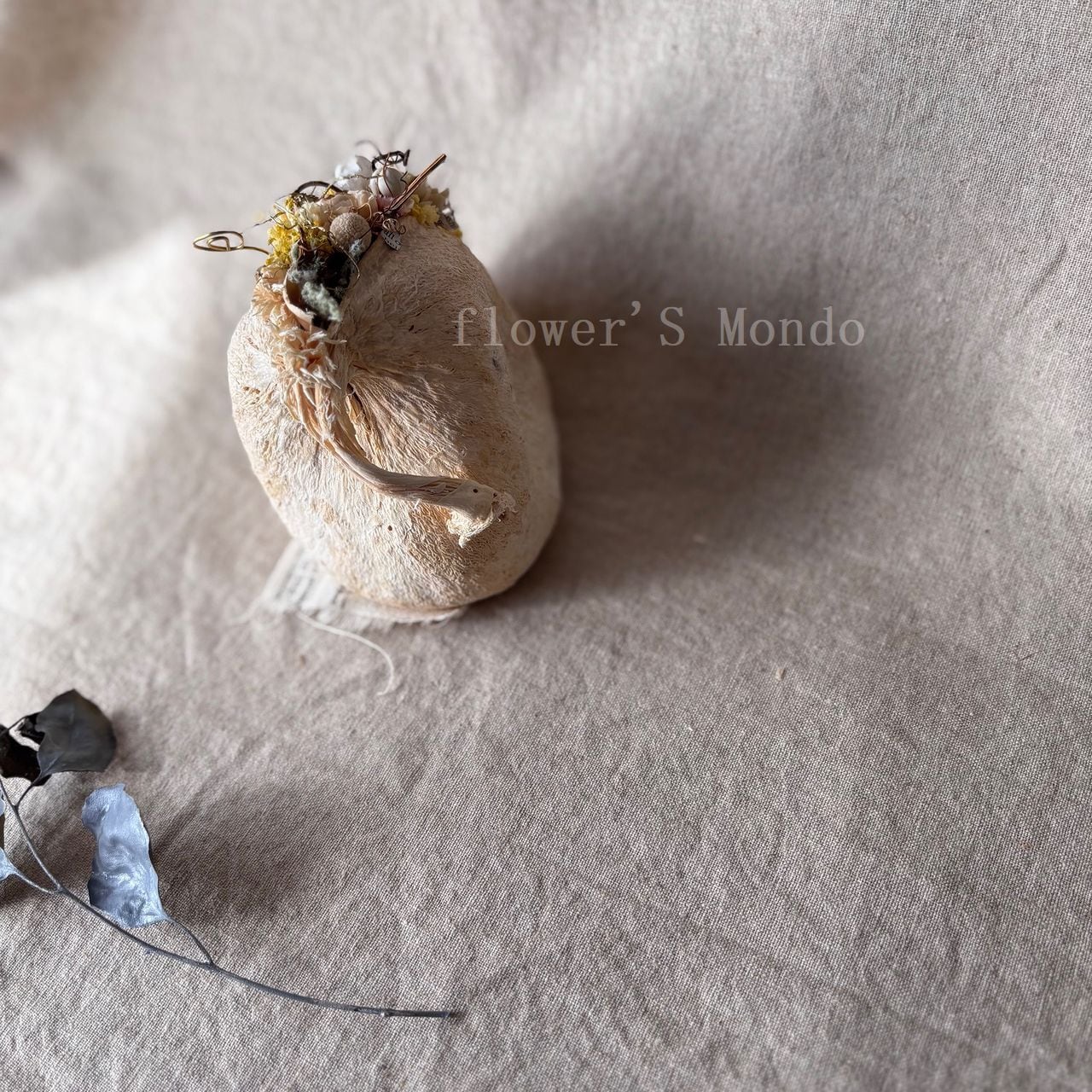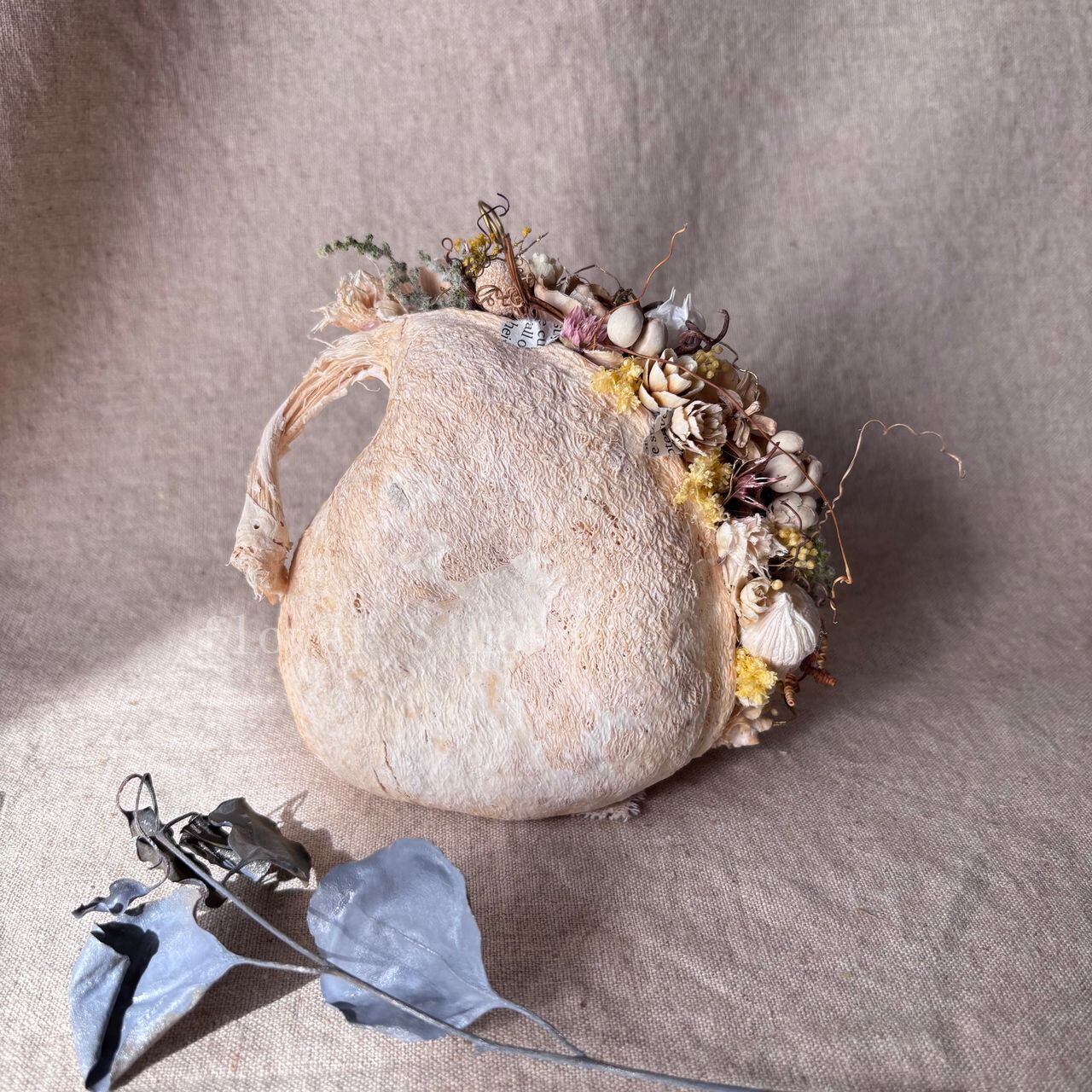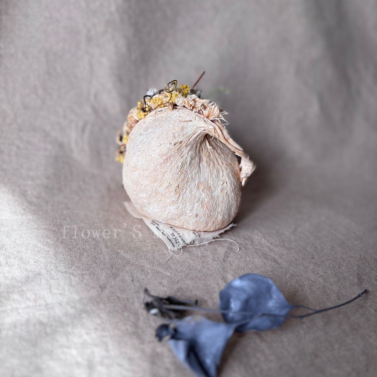 南米原産の大きな実(果実)を乾燥させた天然素材。同じ形がない事が解ります。このような個性的な木の実にお花をアレンジした作品になります。生成りの色合いがナチュラル/素朴/上品/柔らかな印象を出してくれて、なによりぽってりで可愛い♪。色々な角度での撮影をしてございますのでしっかりそのぽってり感を観察してみてください。笑顔が出てきます。