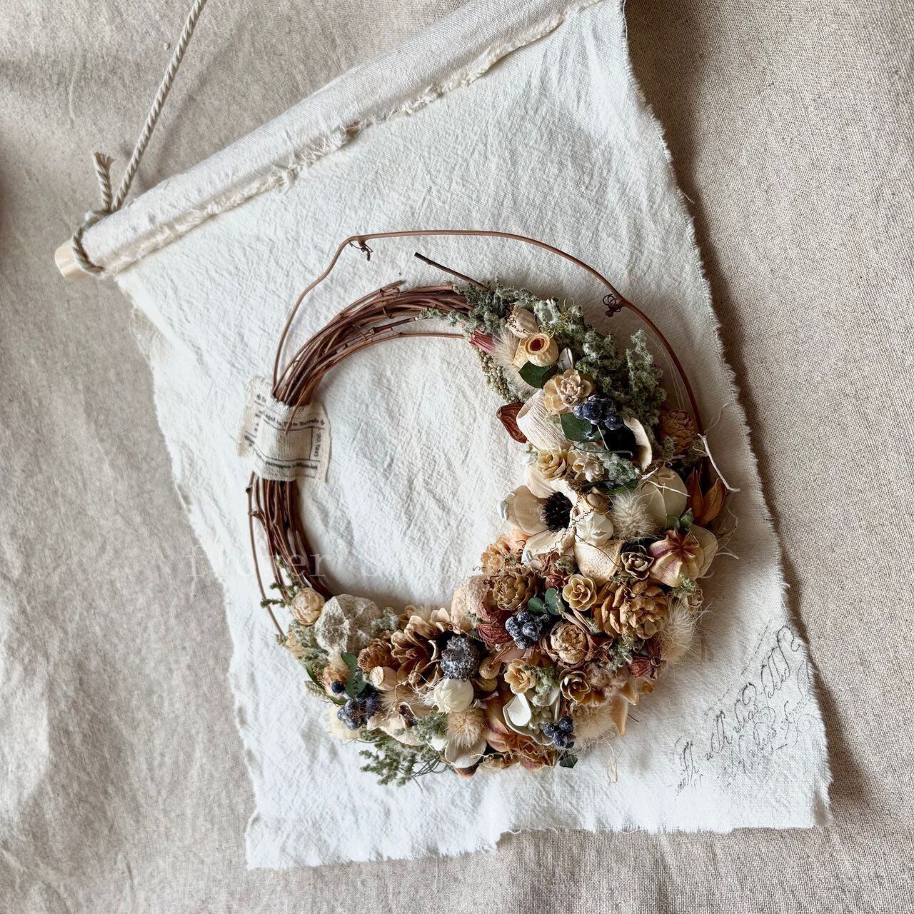 今の新しいリースとはちがってシャビーな落ち着きのある商品にしました。リネンの生地はシャビ―な雰囲気を出すための紅茶で染めました(今回はうすーく目立たないくらいのお色です)。見ていて飽きない、また年月を経て更に本当のシャビーなリースになるように、永く楽しんで頂けるかと思います。そんな変化も楽しんで頂きたいかと思います。
