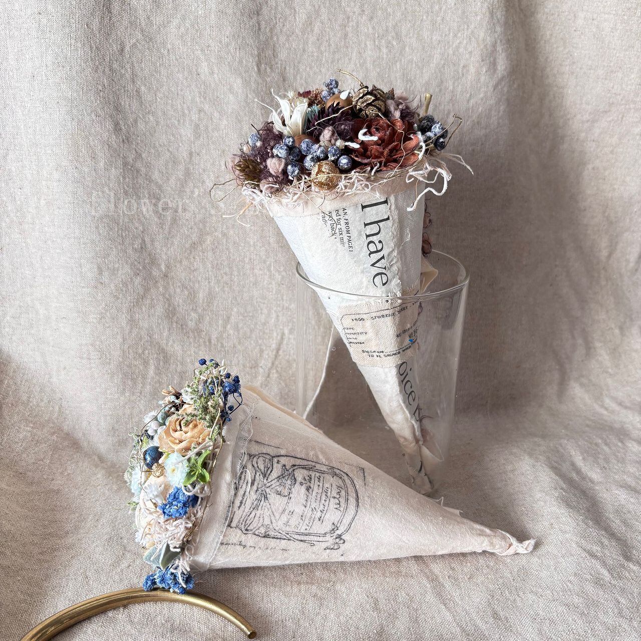 ミントアイス風のお花は青ベースに白、グリーンを交えて春のような夏のような...。ですので1年中OKなお花です。またチョコアイス風のほうも1年中チョコありますもんね♪そんなお花をイメージしたもです。リネンで巻かれたお花は柔らかくもあり、美味しそうでもあり、見ているとほっこりになるのが間違いないです。後ろ側に掛けられますように紐も付いてます。花器に入れて飾って頂いてもよし、かけて眺めるのも良しのお花です。(万が一後ろの紐が離れてしまっても身近なボンドで修復可能です)